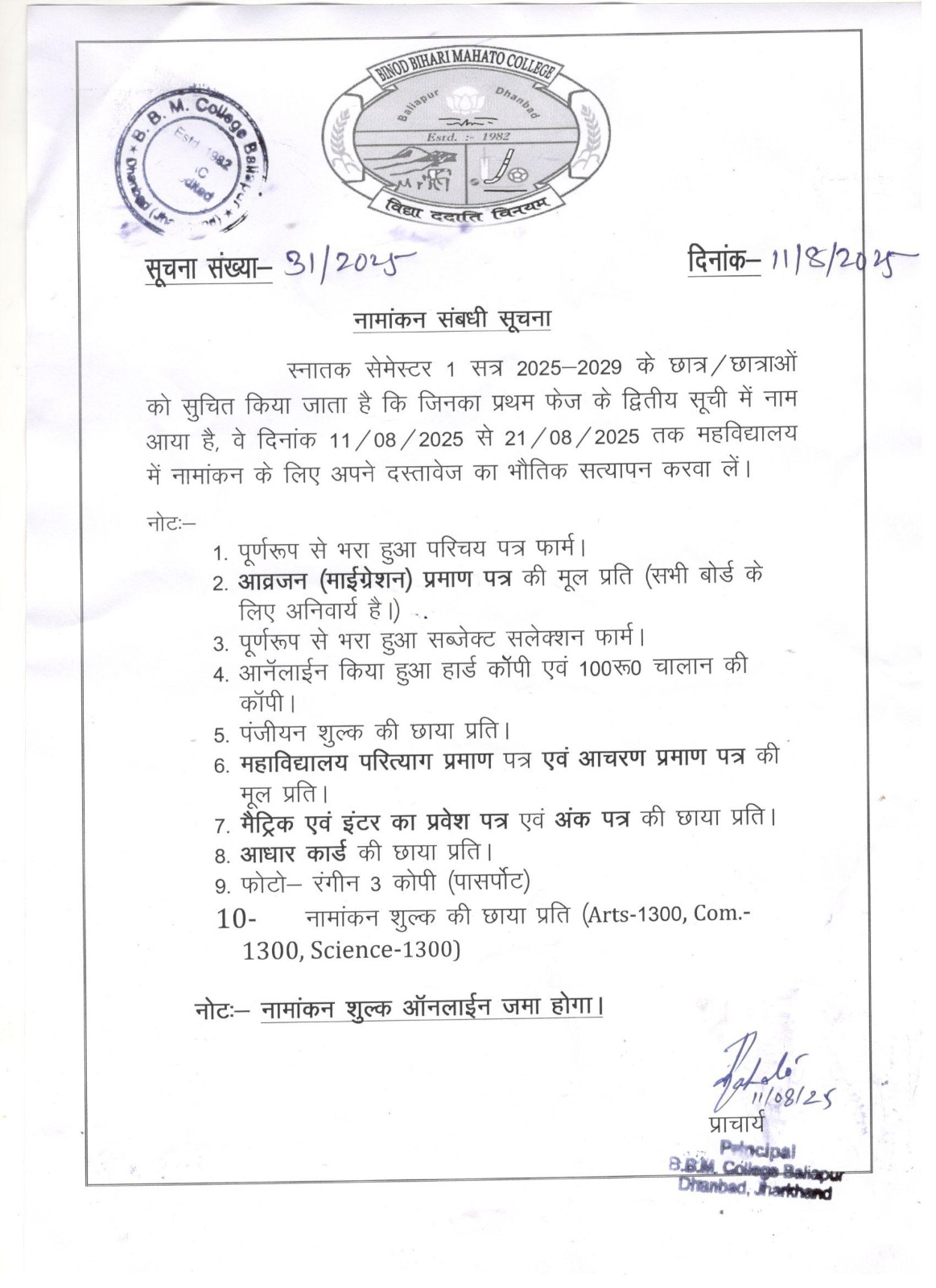 बीबीएम कॉलेज: स्नातक सेमेस्टर-1 नामांकन 11 से 21 अगस्त तक !