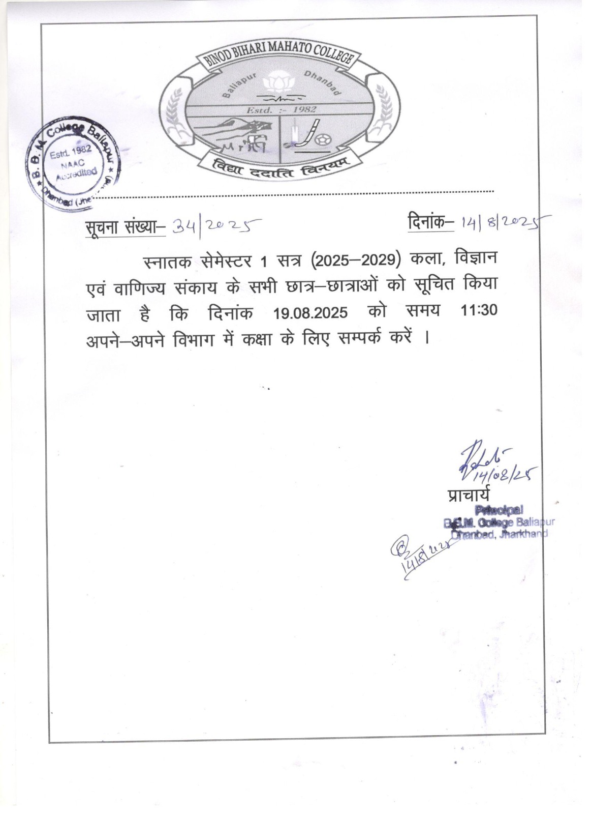 19 अगस्त से स्नातक प्रथम सेमेस्टर की कक्षाएं प्रारंभ, छात्र-छात्राएं समय पर पहुंचे !